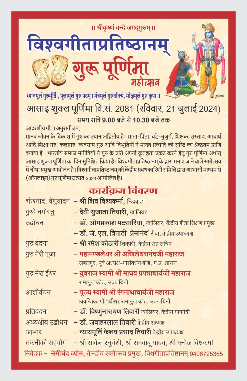 मनुष्य जीवन ज्ञान के बिना शून्य है। हमें अपने कर्तव्य का बोध कराने के लिए गुरु के वचनों का पालन करना होता है गुरु के द्वारा दिए गए ज्ञान से ही मनुष्य का उद्धार हो सकता है । गुरुपूर्णिमा पर गुरुओं का पूजन किया जाता है । जगद्गुरु भगवान श्रीकृष्ण ने गीता का उपदेश देकर सम्पूर्ण विश्व को उपकृत किया है अतः उन्हें जगद्गुरु की संज्ञा दी जाती है मनुष्य को अपने गुरु के प्रति श्रद्धा प्रकट करने और उनका आशीर्वाद लेने के लिए सदैव तत्पर रहना चाहिए इसी उद्देश्य से गुरुपूर्णिमा उत्सव मनाया जाता है ।
